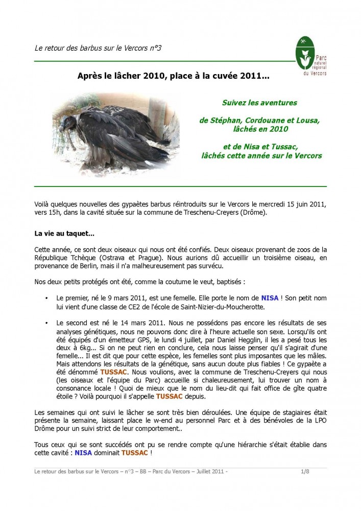 Voici le numéro 3 de la note concernant les Gypaètes dans le Vercors « Retour des barbus sur le Vercors n°3 (document pdf) ». Des nouvelles toutes fraîches des Gypaètes barbus relâchés cette année ! Des oiseaux qui se portent visiblement à merveille. Sans oublier aussi les nouvelles des Gypaètes relâchés l’année derniére en 2010.
